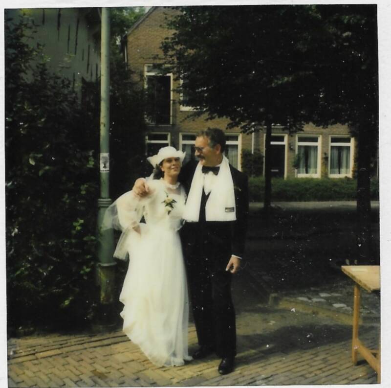 In 1978 hertrouw ik. Eigenlijk willen mijn nieuwe vriendin en ik geen huwelijksceremonie met toespraken, levende muziek, dronken ooms, vileinige tantes, huilende ouders en tenslotte altijd ruzie. Om echter het erfrecht voor mijn zoon te regelen blijkt trouwen goedkoper dan een testament. Dus gaan we op maandagmorgen (dan is trouwen gratis) op de fiets naar het stadhuis. Twee slaperige ambtenaren zijn onze getuigen. Na de “ceremonie” gaan we wandelen in het naburige park. Ik maak met de zelfontspanner onze trouwfoto. Beiden zijn we gehuld in een flink regenjack en we hebben een dikke das om. ’s Middags gaan we weer gewoon naar ons werk..